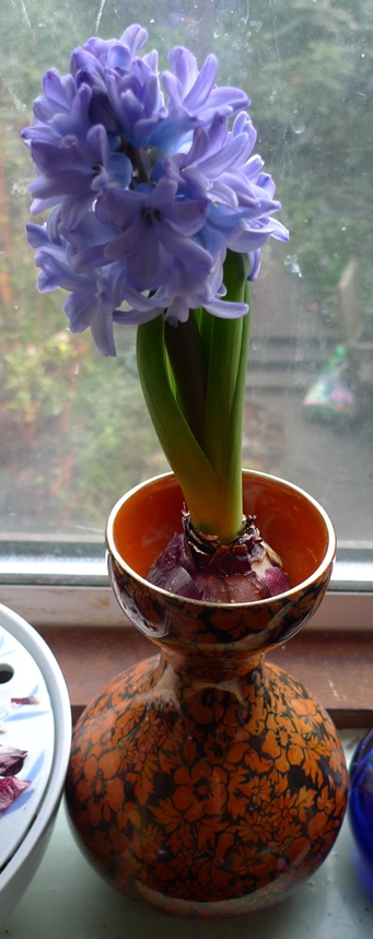 I got 10 prepared Delft Blue bulbs from J Parkers but for some reason only have 6 rows on my spreadsheet for them of which 2 said "lost track" so not many to go on but of the 4 left I have "got there in the end" as they were late and "small but perfectly formed", flower on the right and in the blue Byzanta Ware in the middle