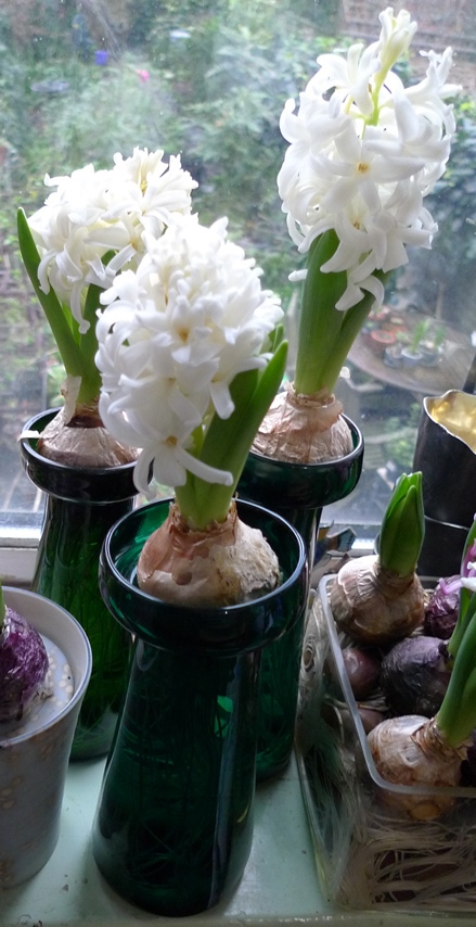 Next forcing year (ie later this year August/September 2016) will definitely use Miss Saigon again and of course Delft Blue. Will need to see which white varieties are availble. Fairy White was ok but small. It was the only white I came across last year when ordering but since then have noticed more, indeed I bought others in the past. Will make sure I have some extremely large bulbs, such as Skyline, for those vases that have the larger opening. Take into account bulbs shrinking a bit when they are being forced.