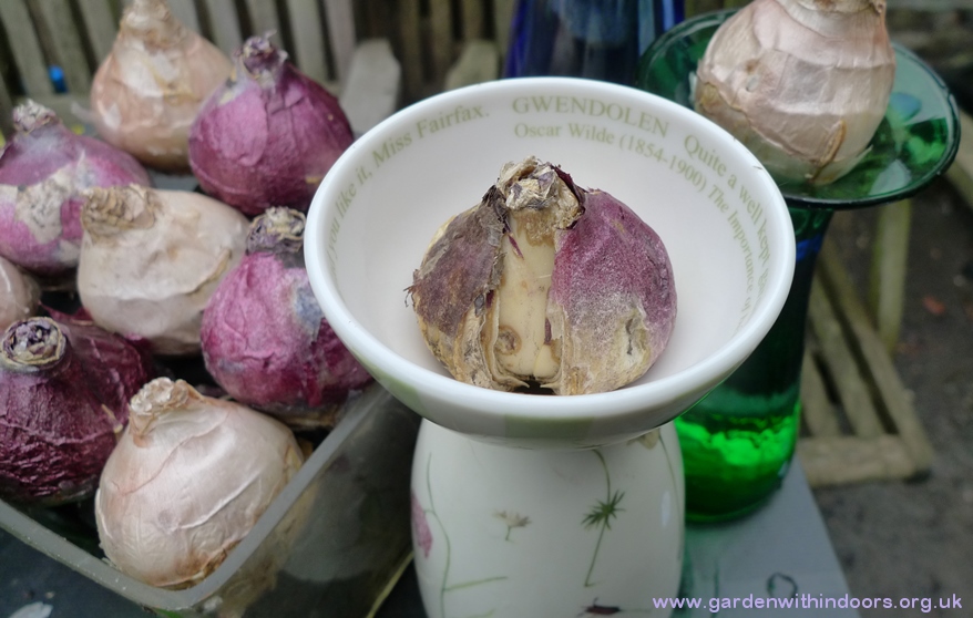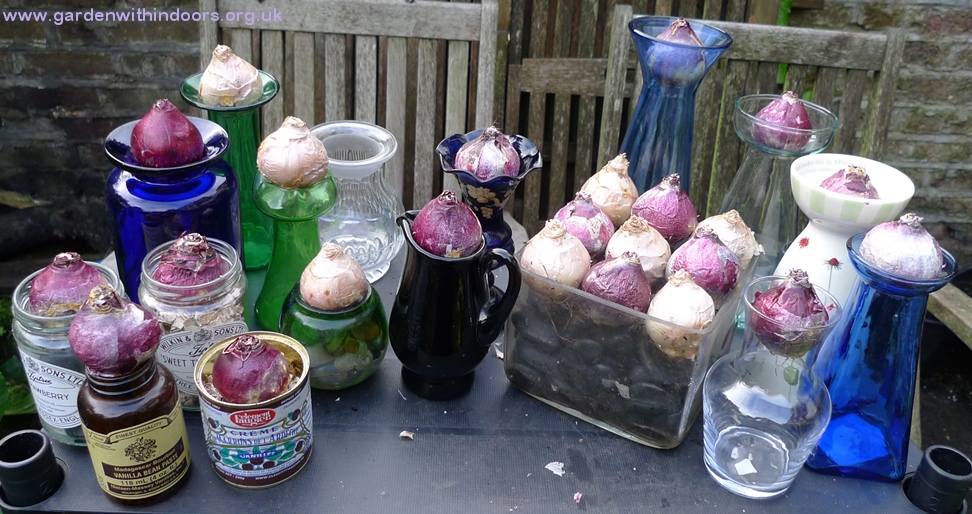 the last bulb bowl with Blue Jacket hyacinths, Pink Pearl in the Hornsea bulb pot, Blue Eyes hyacinth bud in the blue vase, Skyline in the Up the Garden Path Portmeirion vase
