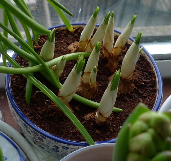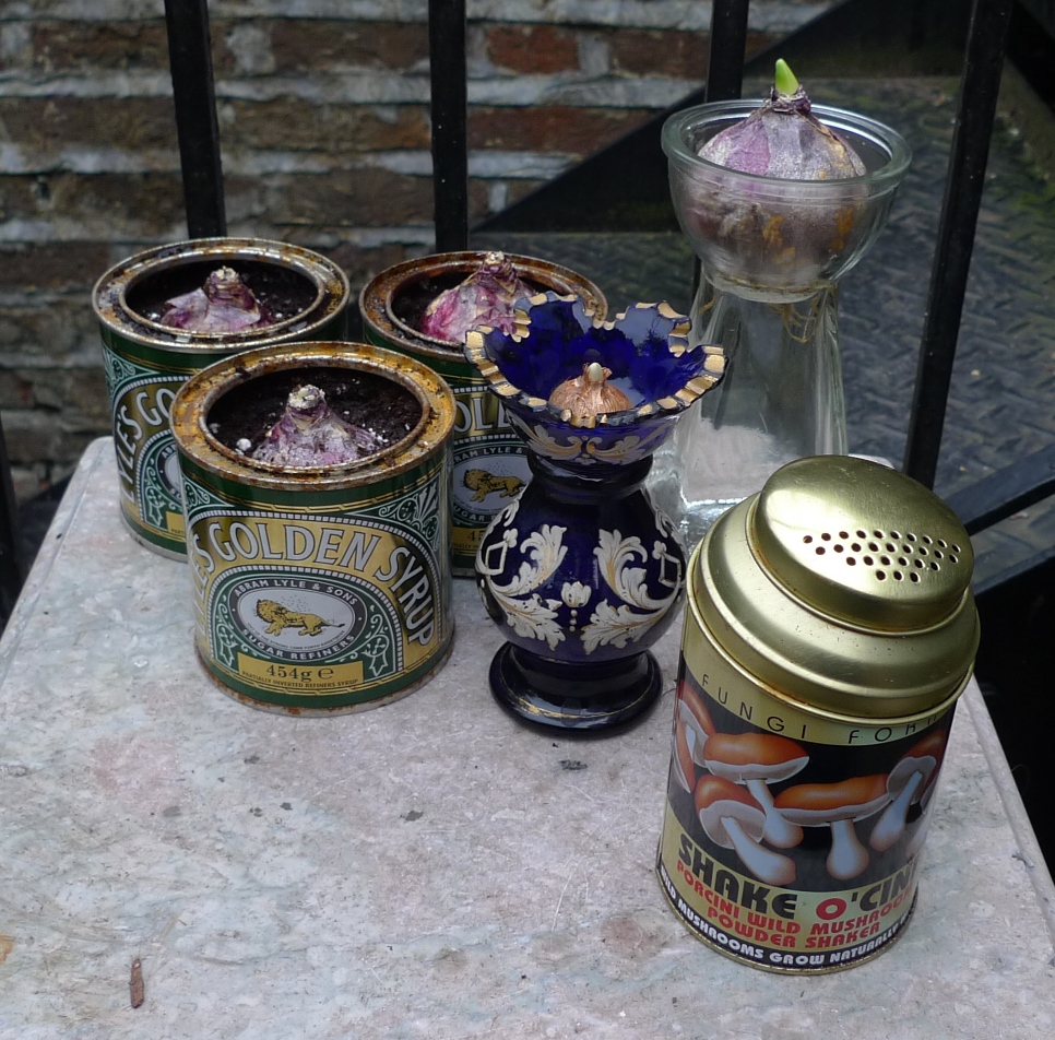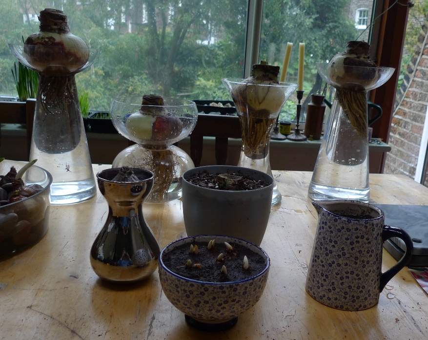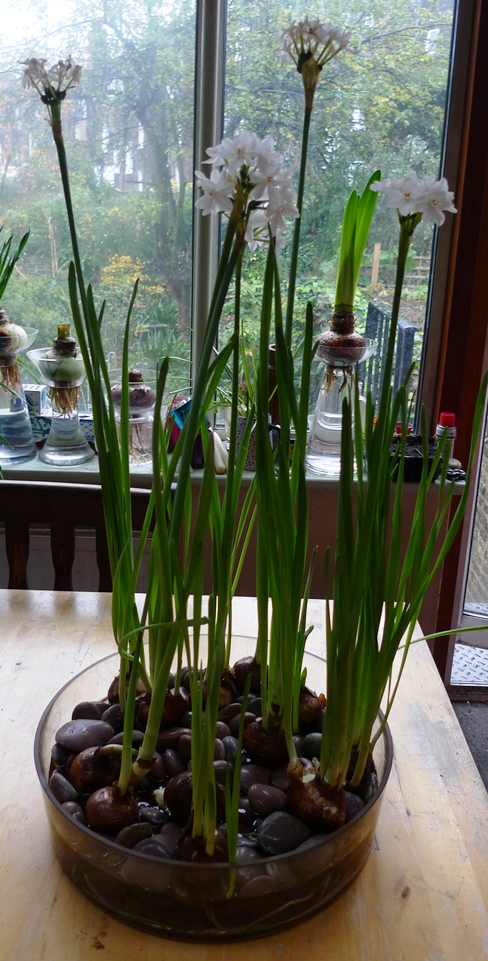 the bulb bowl below has Carnegie hyacinths, one of which is just starting to bloom, also on that table, two SylvaC pots with hyacinths and 3 amaryllis