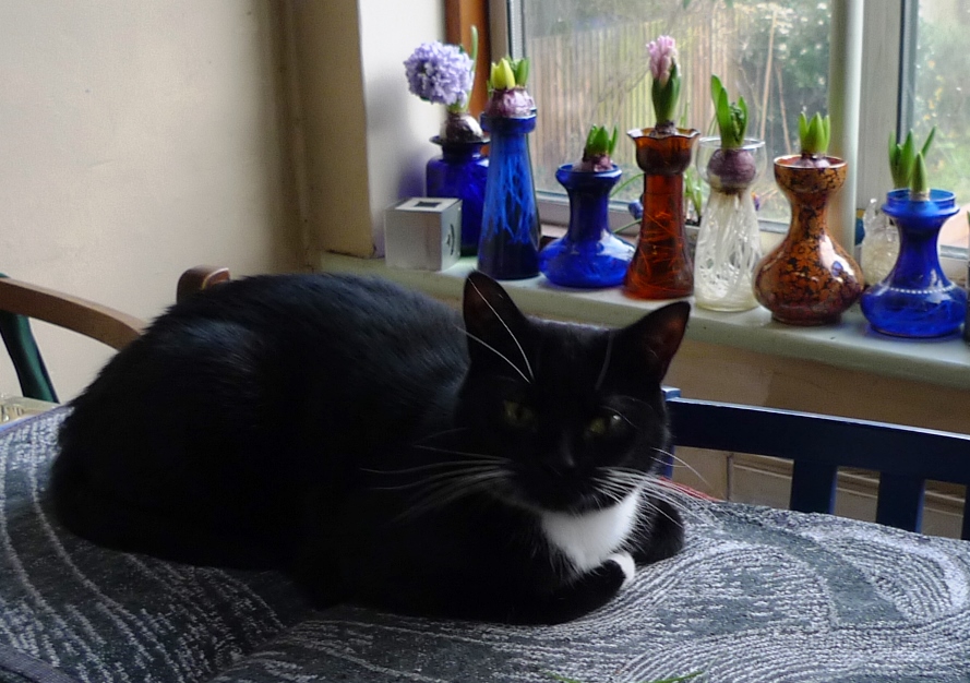 My cat Socks and hyacinths in the background.