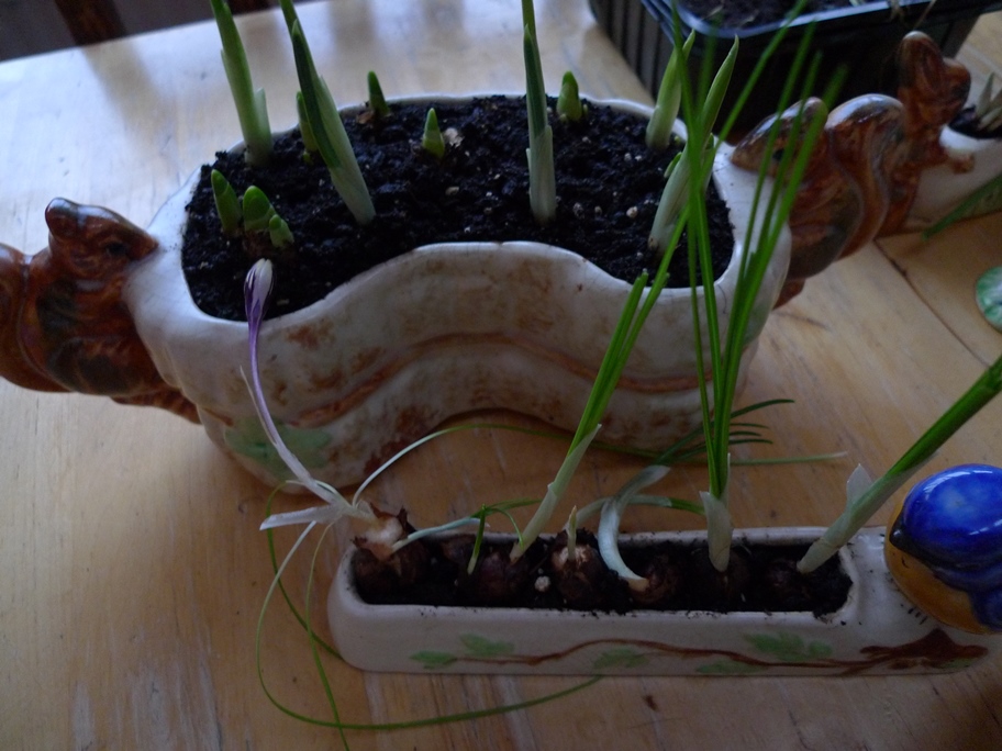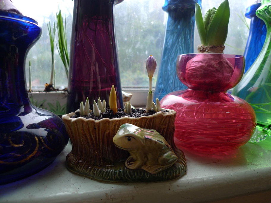 crocus blooms and buds, in the background tulips in the truffle bottles/jars