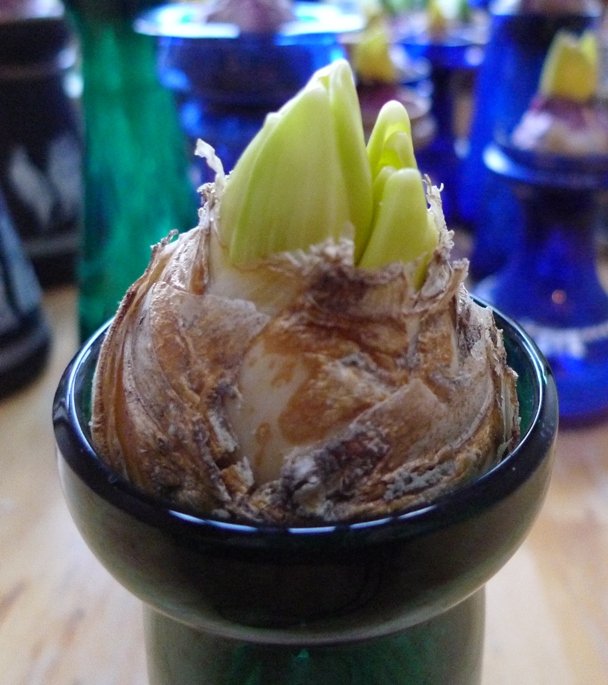 The two tall hyacinths on the right are Sky Jacket. They are generally quite tall with thin flowers, compared to the Delft Blue on the left which is a fat full flower. Notice the secondary stem. That was a bulblet I hadn't noticed until it bloomed. To the left of that is a white Carnegie hyacinth. To the right is a Bristol green vase I bought quite late, too late to grow a hyacinth in this season.