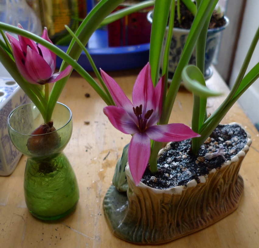 I bought some unprepared hyacinths (Woodstock, Marie and Ibis) and put them in the fridge for 6 weeks to prepare them myself so they were later than everything else. One Woodstock is in bloom (below) and the remaining ones are in the pots pictured below that.