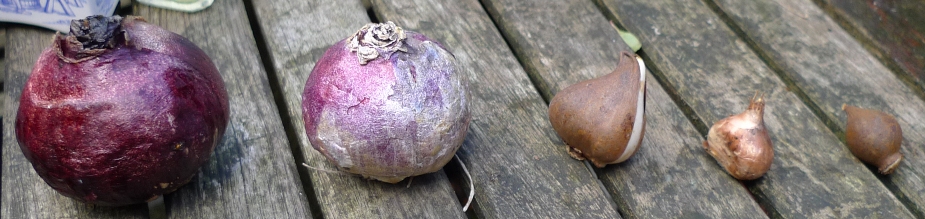 A comparison of bulb sizes, below left to right: large hyacinth, average hyacinth, small tulip, crocus, very small tulip.