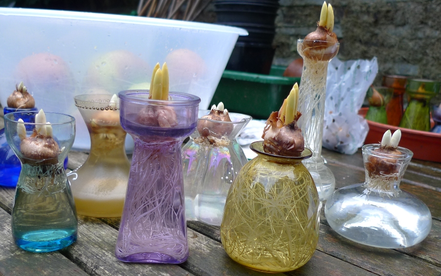The roots are starting their rotting phase and the water is just starting to turn brown but as in previous years I'm sure that will be followed by fresh roots. And the stems are certainly growing strongly already. On the right is a hyacinth vase (from Marks and Spencer) which I was given as a present recently. What a nice pressie to receive! It makes a nice contrast with the amaryllis to highlight the size differences. It should be it in the cellar.