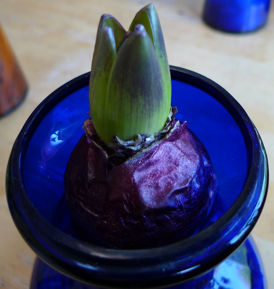 One of these hyacinth bulbs is definitely ready to come out of the cellar but one of them is not, the others in between . I guess that's the drawback of a bulb bowl with 5 bulbs. I hope they will catch up.