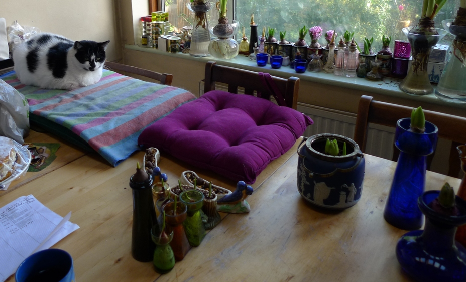 I took the crocus vases out of the cellar recently. The crocus stems don't have flower bulges like hyacinths but at that height I thought they must be ready to come out.