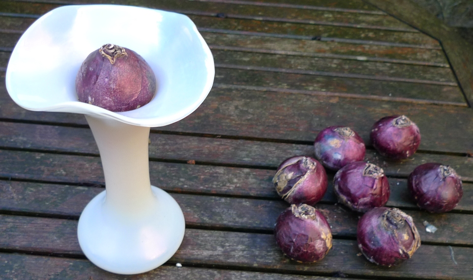 That white vase is just too small for those enormous amaryllis bulbs (see pic below) so I decided to try it with a hyacinth bulb instead. These Delft Blue bulbs are very large anyway so certainly seem good for this white vase. It's rather late to start a hyacinth in a vase but not completely unreasonable, within a feasible timeframe.
